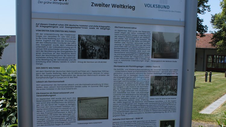 Die neue gut sichtbare, große Geschichts- und Erinnerungstafel am Fuße der Kriegsgräberstätte informiert über Ereignisse der Stadt Lebach im Zweiten Weltkrieg sowie über das Projekt „Lernort Lebach“. Zudem befindet sich nun eine neue Stele am Grab eines Zwangsarbeiters, sodass man vor Ort sein Schicksal nachlesen kann. Bereits seit 2016 läuft das Projekt „Lernort Lebach“, das vom Landesverband Saar des Volksbundes Deutsche Kriegsgräberfürsorge e.V. initiiert und mithilfe von Schulen, Ehrenamtlichen sowie vom Historischen Verein Lebach mitgestaltet und von mehreren Ministerien und Förderern finanziert wurde.