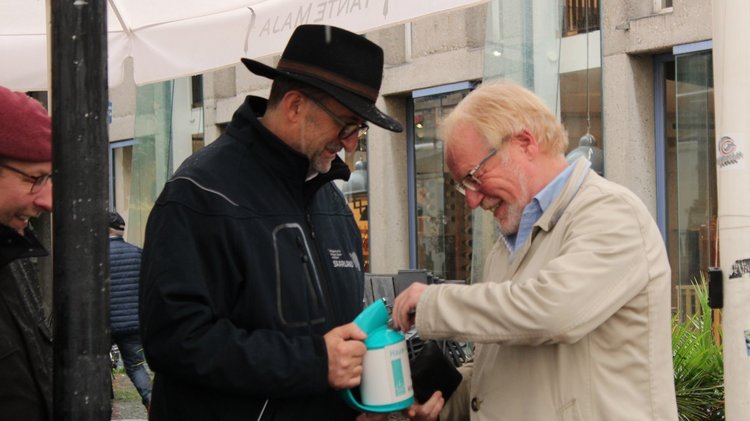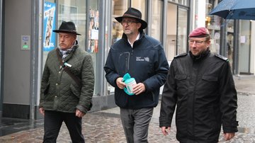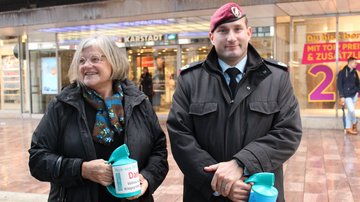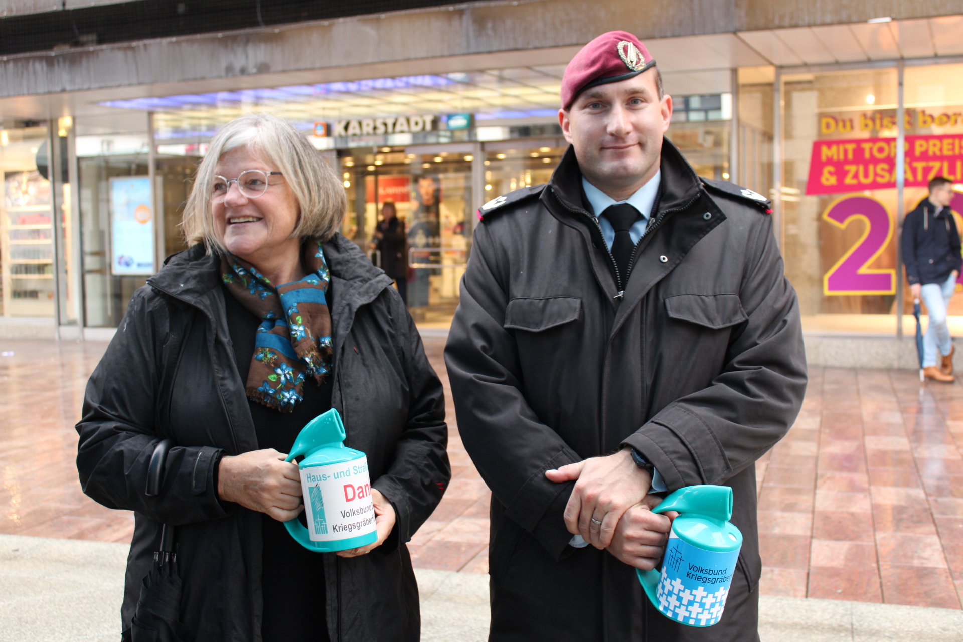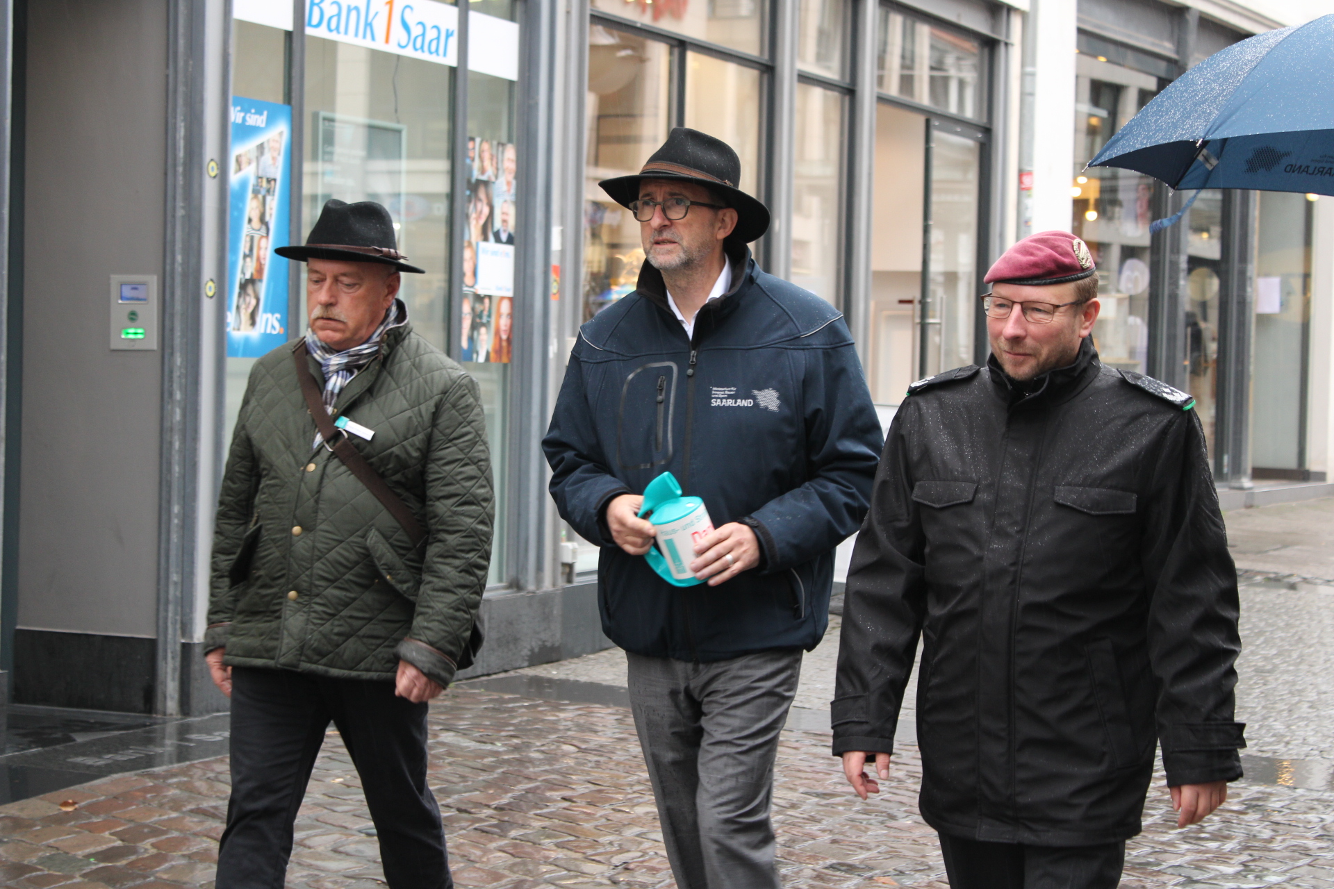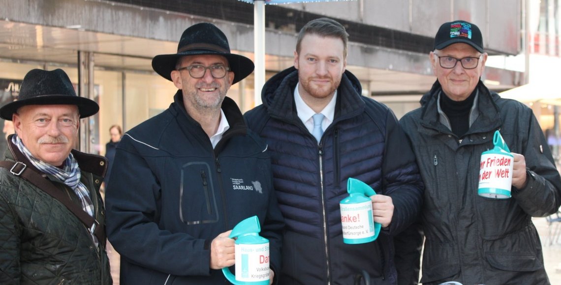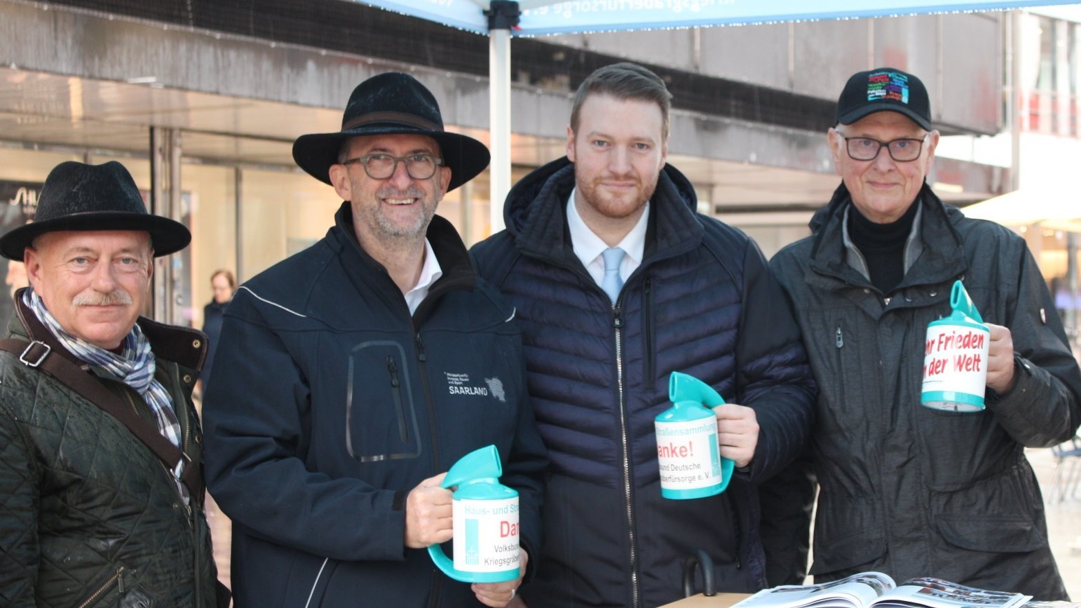 Anlässlich der anstehenden Sammlung trafen sich am Freitag, 21.10., Dagmar Heib, Erste Vizepräsidentin des Landtags, Reinhold Jost, Minister für Inneres, Bauen und Sport, Tobias Raab, Dezernent der Stadt Saarbrücken, Oberstleutnant Matthias Kubenz vom Landeskommando des Saarlandes, Oberstleutnant Falko Schwarz von der Luftlandebrigade 1, Oberstleutnant d.R. Achim Armbrust vom Kreisverbindungskommando Saarbrücken sowie Vertreter des Volksbundes in der Bahnhofstraße in Saarbrücken, um für den Volksbund zu werben und Spenden zu sammeln.