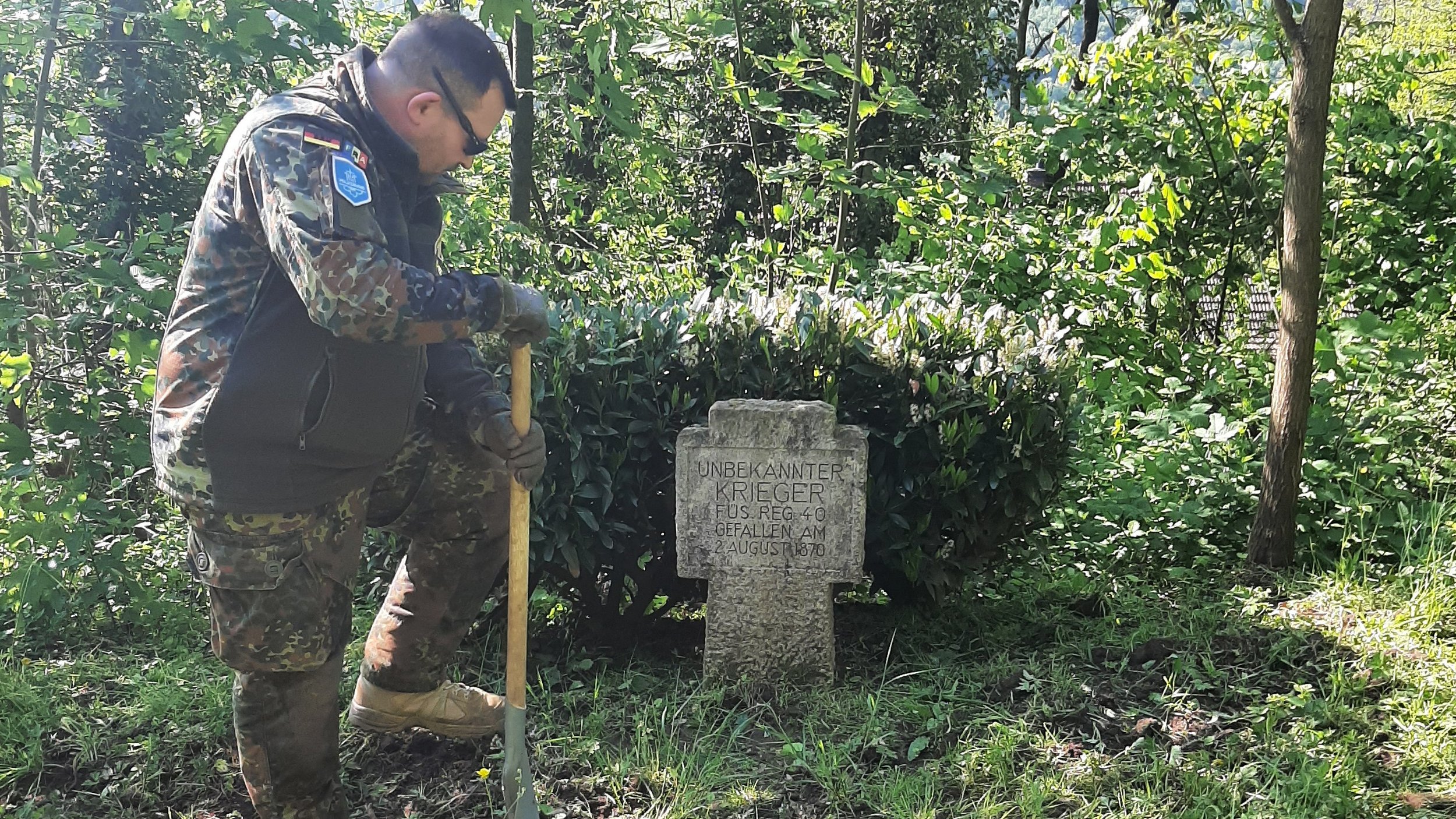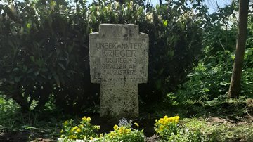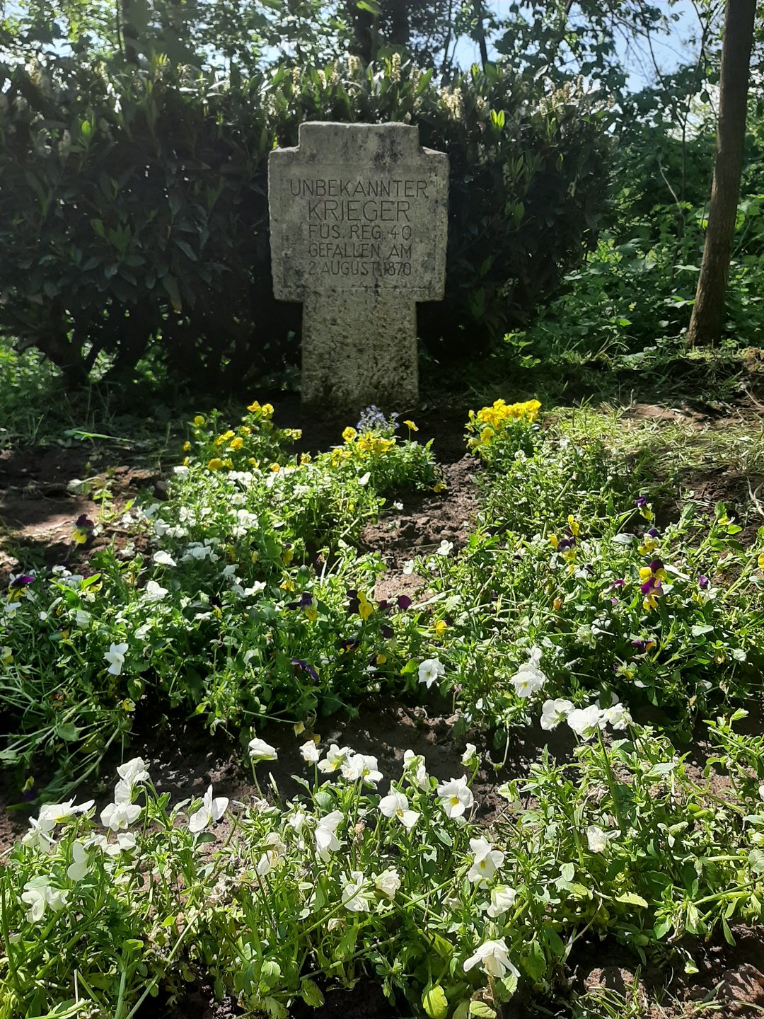 Ein sonniger Frühlingstag kündigt sich an diesem Samstag im Mai an. In einer ruhigen, höher gelegenen Straße in St. Arnual steht eine Bank mit Blick auf Saarbrücken. Wer will, setzt sich her und genießt die Aussicht. Wahrscheinlich würde niemandem auffallen, dass er wenige Meter von einem Grab entfernt sitzt. Nur bei näherem Hinschauen sieht man, dass das fast kniehohe Gras und die Butterblumen um einen Grabstein herum wachsen. Auf diesem steht: „Unbekannter Krieger Füs. Reg. 40 gefallen am 2. August 1870“.