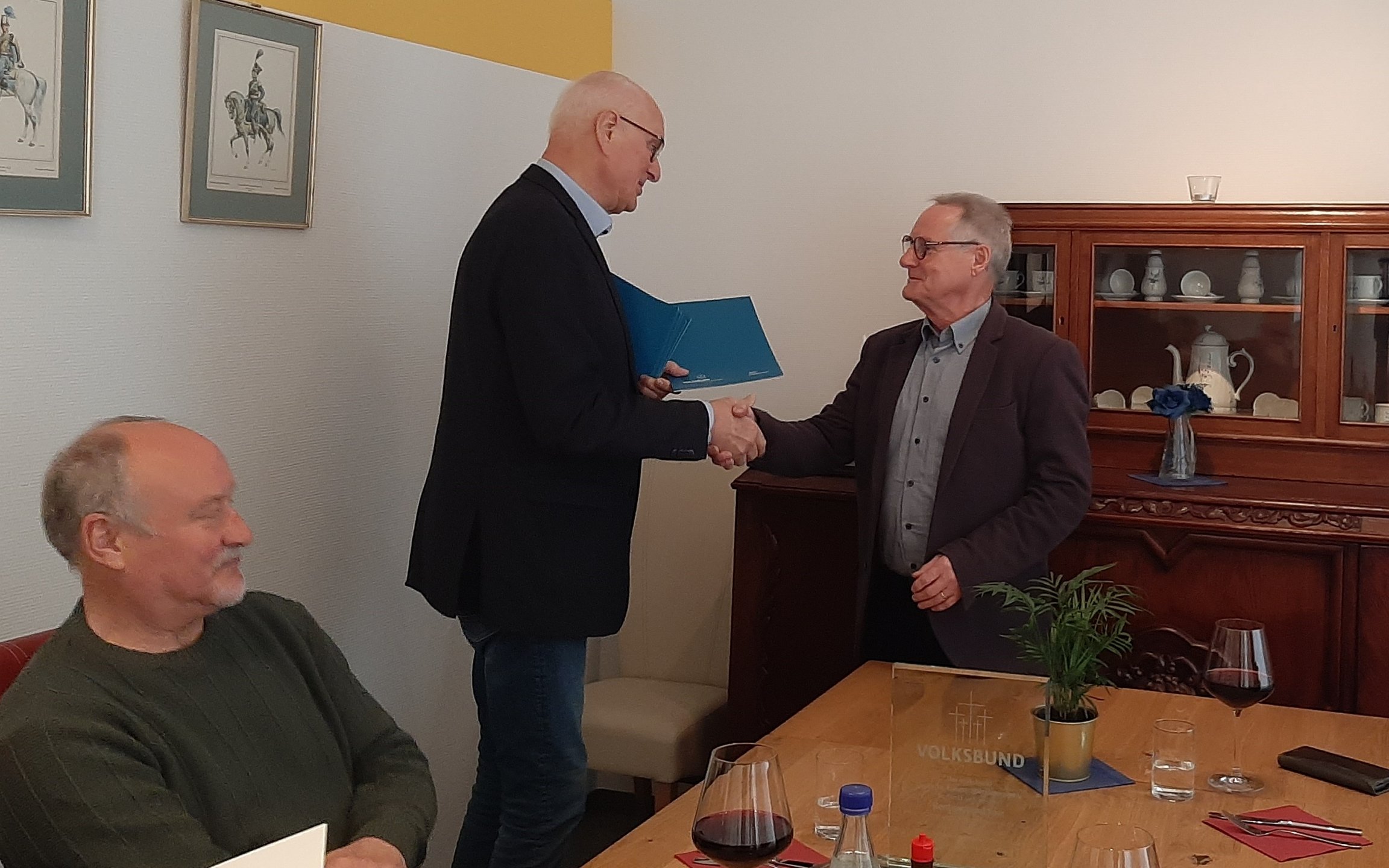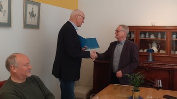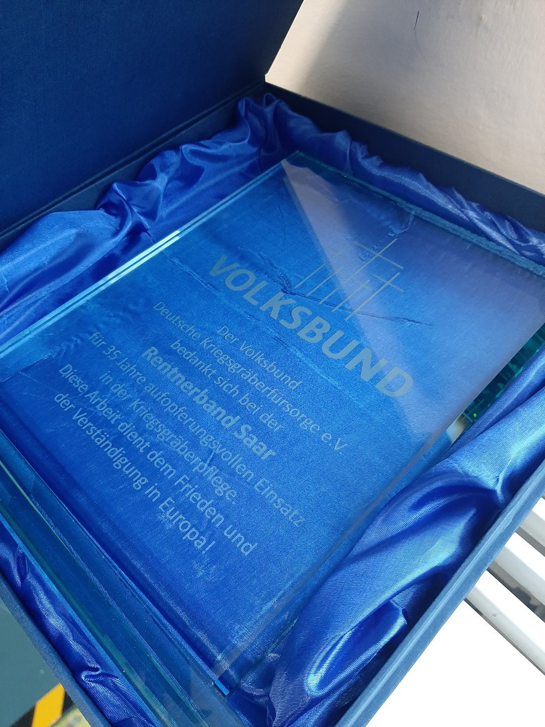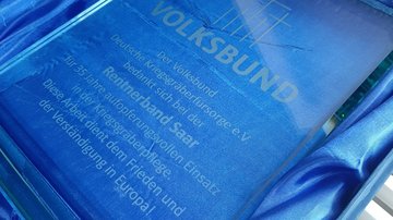 Im Rahmen eines gemeinsamen Mittagessens im Offiziersheim der Graf-Werder-Kaserne überreichte Landesvorsitzender Werner Hillen Karl-Heinz Wern stellvertretend für die Gruppe einen Glaspokal mit der Gravur „Der Volksbund Deutsche Kriegsgräberfürsorge e.V. bedankt sich bei der Rentnerband Saar für 35 Jahre aufopferungsvollen Einsatz in der Kriegsgräberpflege. Diese Arbeit dient dem Frieden und der Verständigung in Europa!“. Jedes Mitglied erhielt zudem eine Urkunde – vier von ihnen waren der Einladung des LV Saar gefolgt und aus Oberthal angereist.