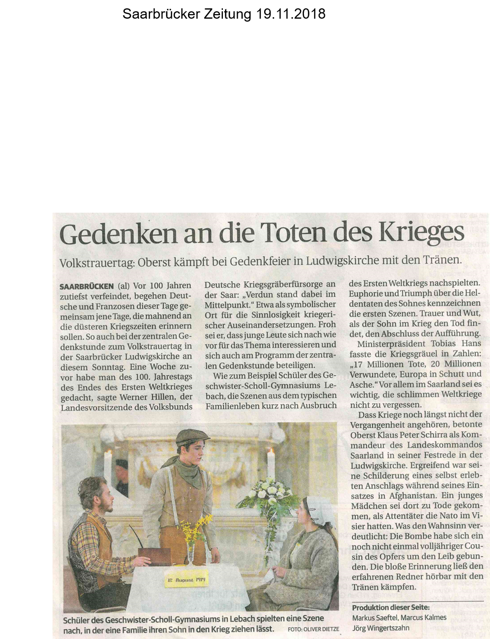 - 19.11.2018: Saarbrücker Zeitung: Bewegende Gedenkfeier am Volkstrauertag in der Ludwigskirche