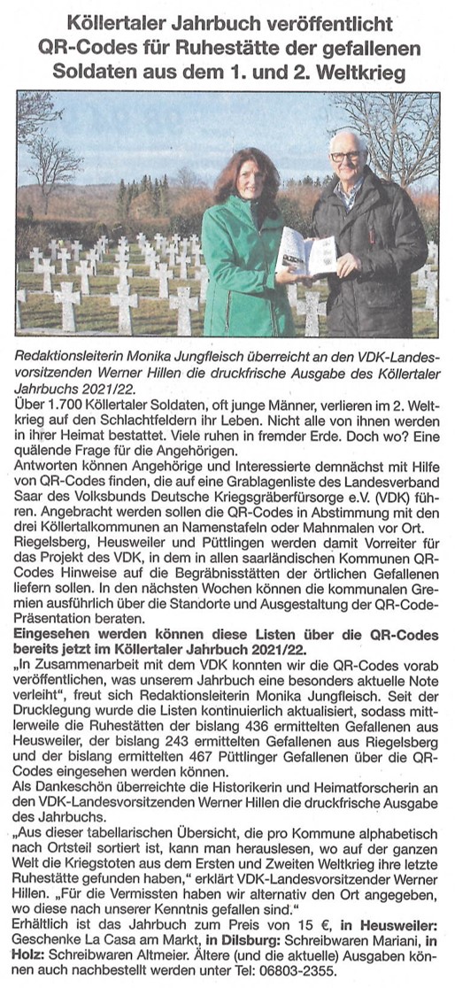 - 23.02.2022: Heusweiler Wochenpost: Köllertaler Jahrbuch veröffentlicht QR-Codes für Ruhestätte der gefallenen Soldaten aus dem 1. und 2. Weltkrieg